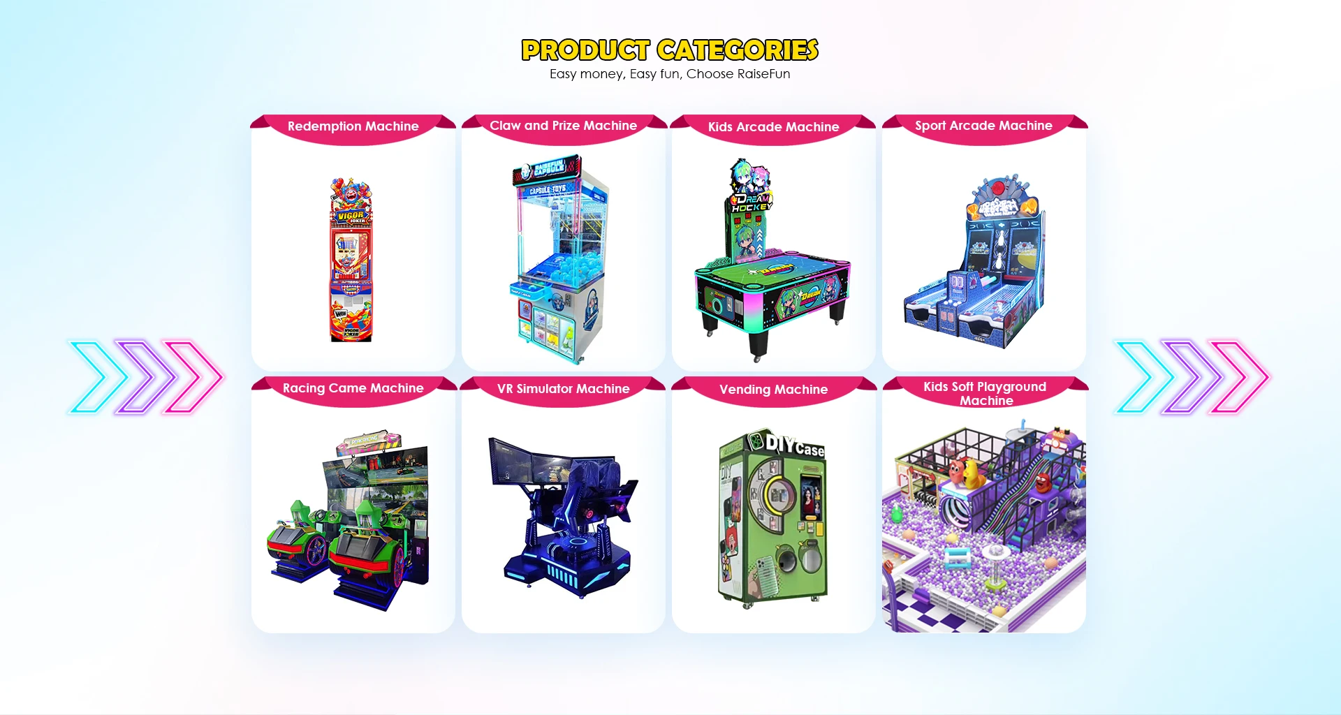 Productos principales:Máquinas de redención, máquinas de premios, máquina de arcade deportivo, máquina de arcade para niños, máquina expendedora